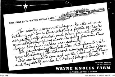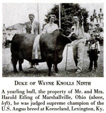 Of all the pure-bred bulls raised at Wayne Knolls Farm, there was one that put Wayne Knolls Farm on the map. "Duke of Wayne Knolls" was named grand champion and supreme champion at the 1949 American Aberdeen-Agnus Breeders' Futurity. The Duke of Wayne Knolls was featured in Life magazine, According to the Akron Beacon Journal in 1950, "The Duke, bred and reared on the Etling Wayne Knolls Farm, is recognized as the best among the country's Aberdeen-Angus animals."